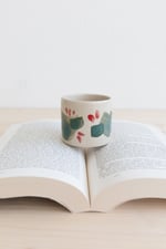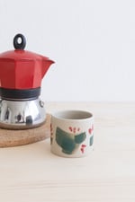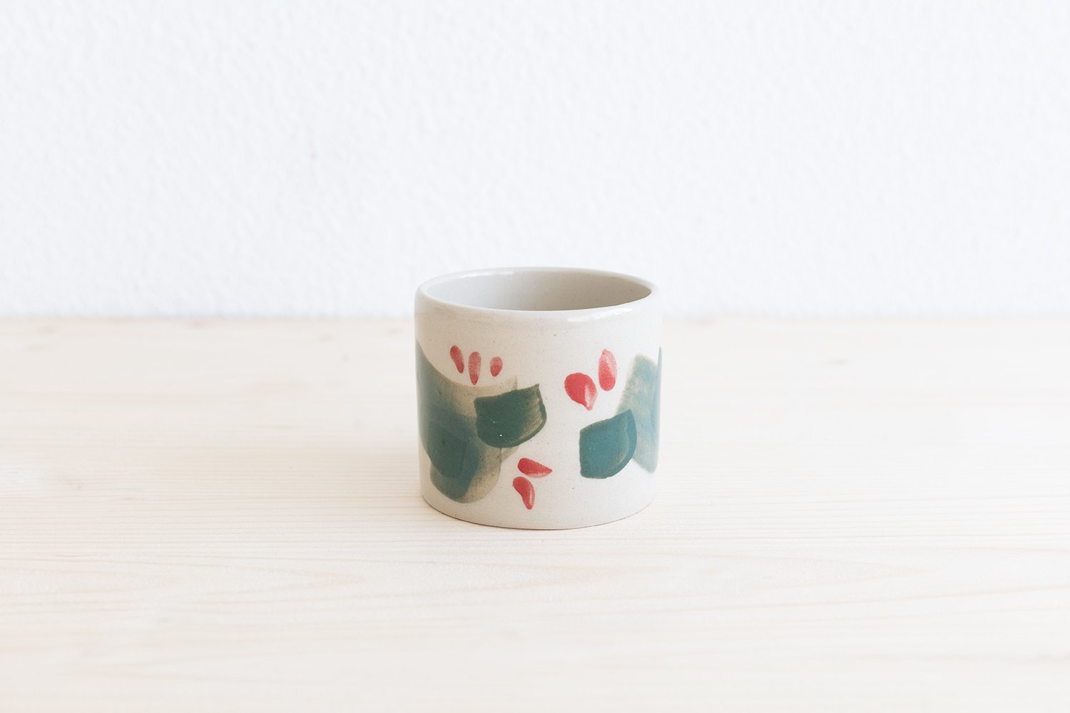 Espresso cup made of stoneware clay, decorated with coloured underglazes and a final glossy transparent glaze.