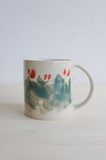 Mug made of stoneware clay, decorated with coloured underglazes and a final glossy transparent glaze.